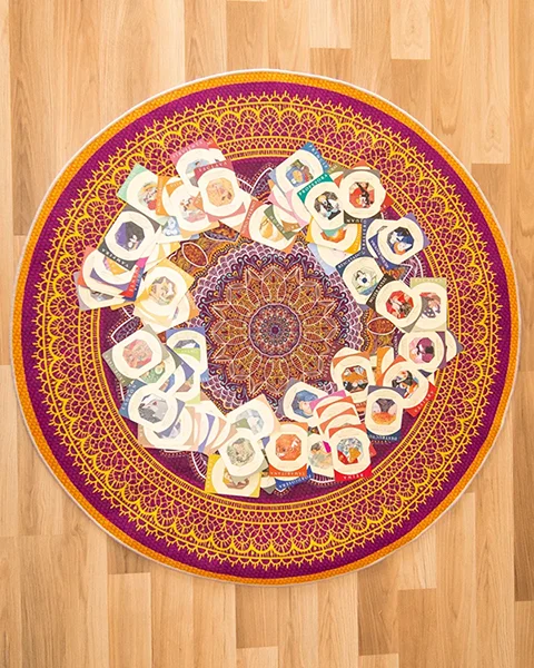 Catibel Nebot Puigròs y yo ofrecimos tres talleres sobre los chakras y sus arquetipos asociados. Combinamos clases de Hatha Yoga con posturas específicas para activar los chakras, con meditaciones guiadas relacionadas con los temas de cada chakra y la lectura del oráculo de Caroline Myss. Contiene 74 cartas con arquetipos que nos pueden conectar con temas personales no vividos.